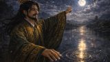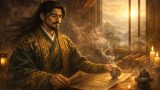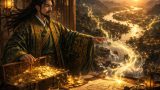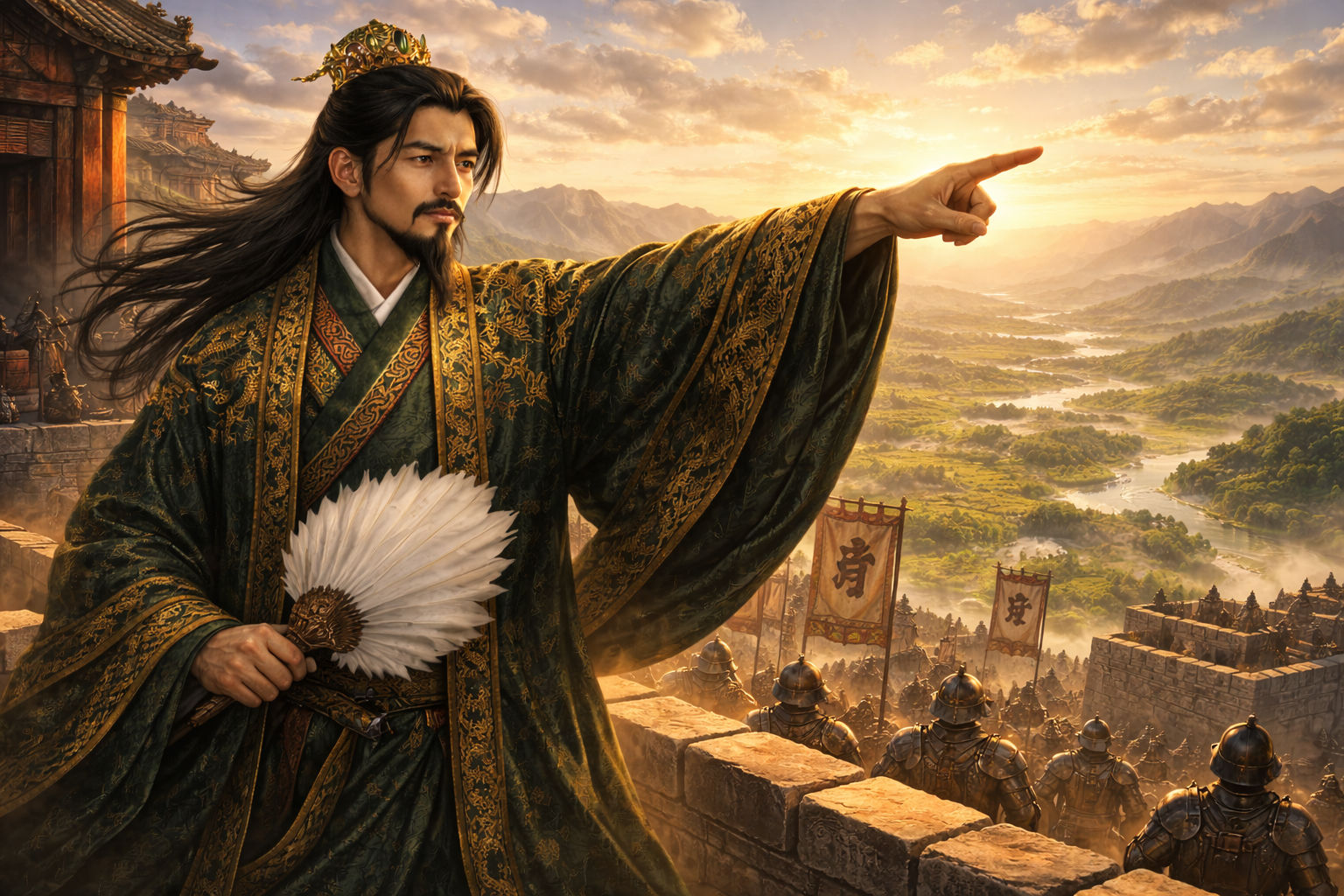 三国志の歴史を塗り替えた天才軍師、諸葛孔明。彼はダークグリーンの高貴な衣をなびかせ、黄金の冠を戴きながら、常に「動くべき時」を見定めていました。