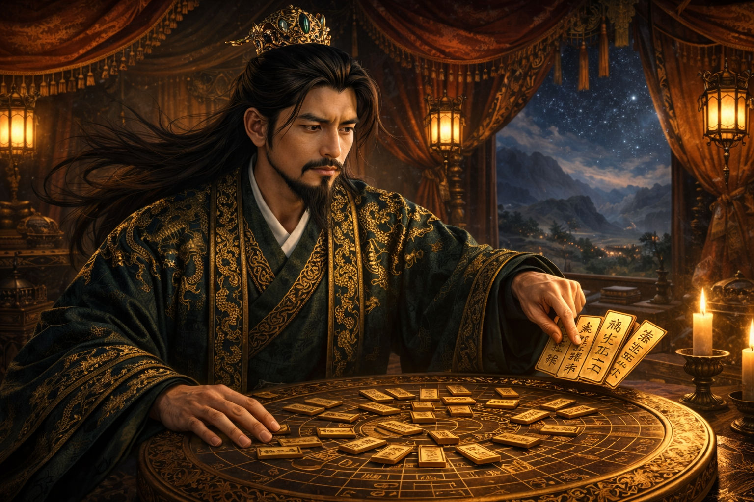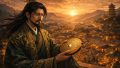 彼は戦場で勝利を収めるだけでなく、国を豊かにし、人々の暮らしを安定させるためにも、目に見えないエネルギーを活用しました。ダークグリーンの豪華な装束に身を包み、黄金の冠を戴いた彼は、計算によって「富が湧き出る方位と時間」を正確に割り出していたのです。