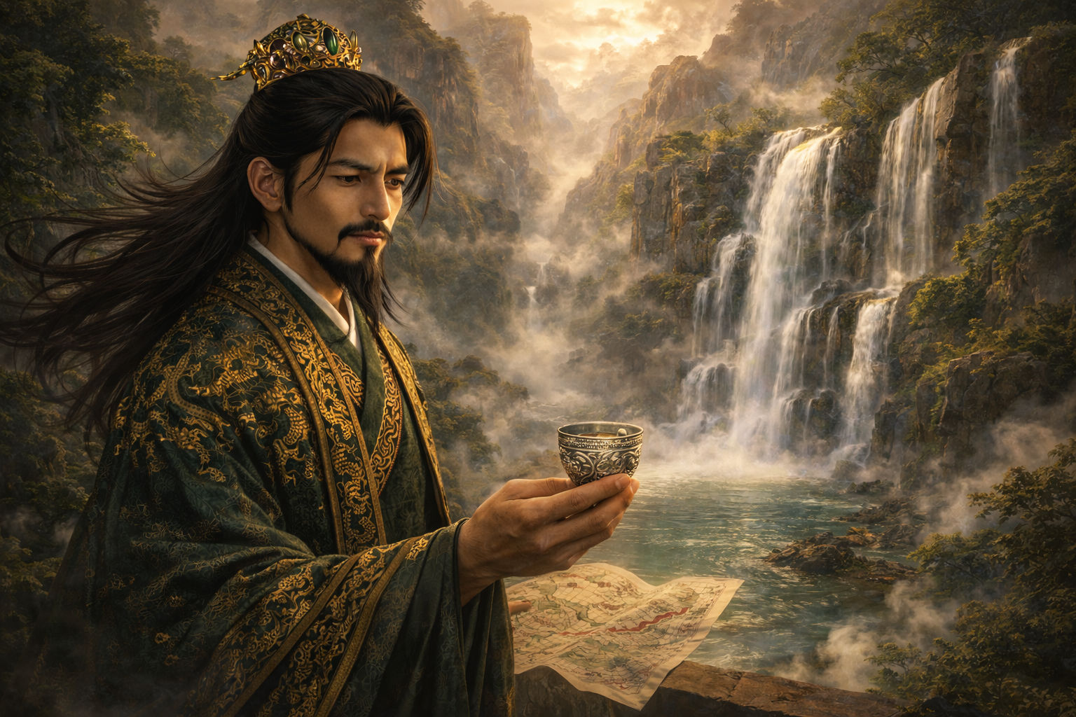 三国志の戦場において、諸葛孔明は常に「静寂」の中にいました。ダークグリーンの豪華な衣を纏い、黄金の冠を戴いた彼は、激動の戦の中でも「大地の呼吸」を感じ取っていました。