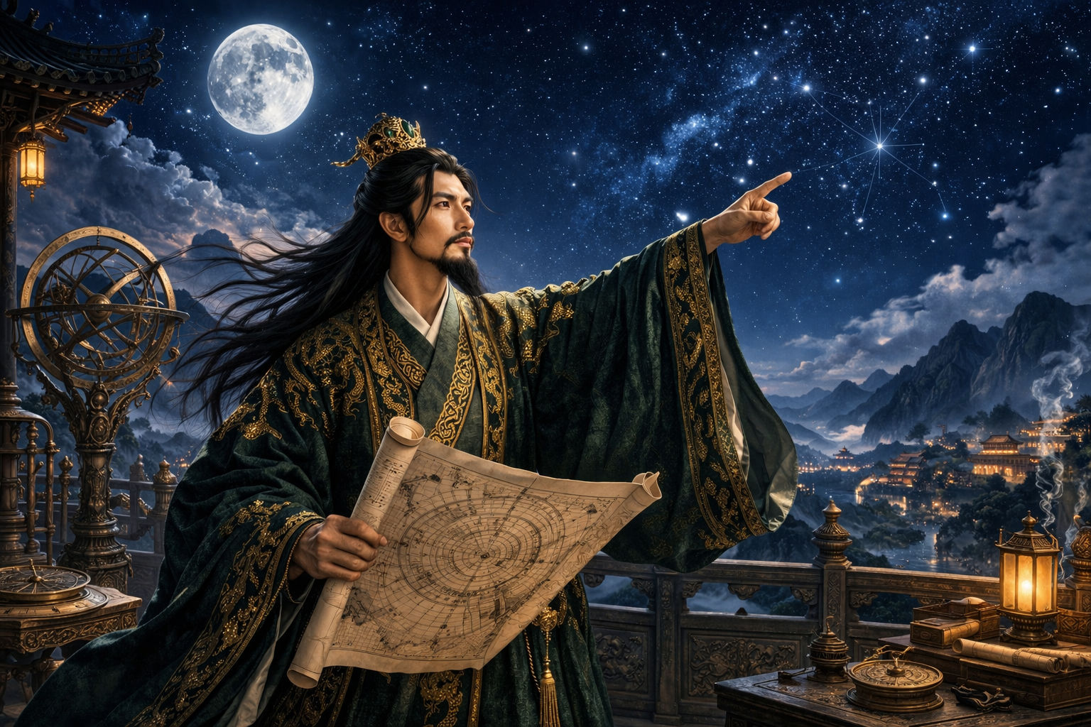 彼はダークグリーンの衣をなびかせ、黄金の冠の下で冷静に星を読みました。彼にとって、時間は単に流れるものではなく、「どの瞬間にどの方向に動けば、未来を書き換えられるか」を示す地図そのものでした。