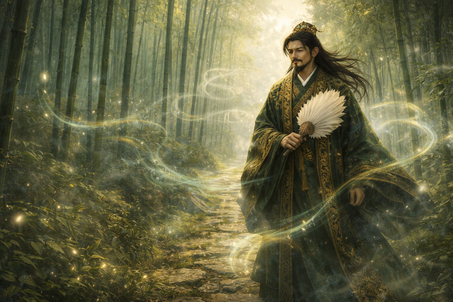 三国志の天才軍師、諸葛孔明。彼はダークグリーンの豪華な衣装を纏い、黄金の冠を戴きながらも、戦場や宮中において、しばしば独りで散策する時間を持ちました。